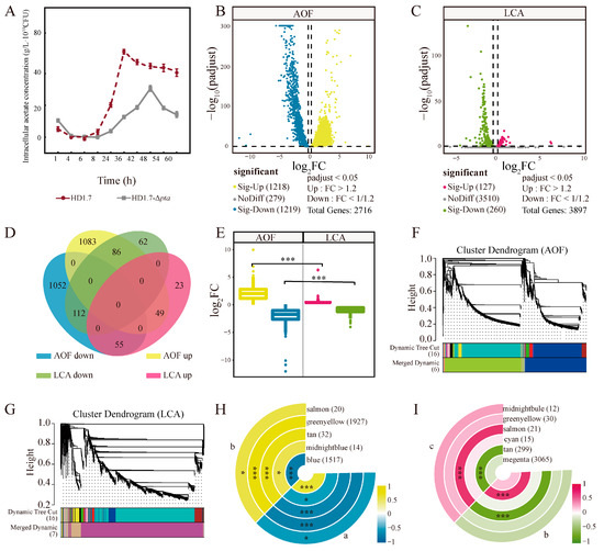 Changes of genes in HD1.7 with different acetate-producing capacity before and after the “acetate switch”. (A) Intracellular acetate content of HD1.7 and strain HD1.7-Δpta under 5 g/L glucose conditions; (B) Volcano gram of DEGs in the AOF group; (C) Volcano gram of DEGs in the LCA group; (D) Venn diagram of DEGs in AOF vs. LCA; (E) Variance analysis of DEG in LCA and LCA, the color labeling involved in this figure is consistent with that in 4D.; (F) WGCNA of DEGs in the AOF group; (G) WGCNA of DEGs in the LCA group; (H) Ringed heat map of modular trait in WGCNA associations of AOF, where each ring represents a module, the letters in the figure indicate the treatment groups; (I) Ring heatmap of module trait associations in WGCNA of LCA, where each ring represents a module, the letters in the figure indicate the treatment groups. “*” indicates “p < 0.05”; “***” indicates “p < 0.001”.