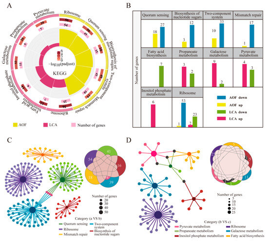 In the LCA, the ribosomal pathway, pyruvate metabolism, propionate metabolism, galactose metabolism, inositol phosphate metabolism, and fatty acid biosynthesis pathway were significantly enriched (p < 0.05), which were all related to acetate metabolism (Figure 5A). Both b and c groups had low acetate content, due to the consumption of acetate as the backup carbon source when HD1.7 grew to the late stationary stage in the former case, and the change in acetate metabolism in the latter case. This also explained the cellular response to acetate metabolism before and after the “acetate switch” point. Overall, both AOF and LCA were co-enriched in the ribosome pathway, with 54 and 25 DEGs, respectively, suggesting that this pathway was jointly influenced by acetate content. The number of downregulated genes in each pathway was higher in AOF, whereas the number of upregulated genes in each pathway was higher in LCA, except for the inositol phosphate metabolism (Figure 5B).