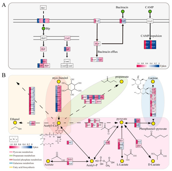 DltA, dltB, dltC, and dltD are two-component system genes that can modify cell wall composition and antibiotic resistance ability in Gram-positive bacteria [41]. Moreover, braD, braS, braR, and vraD are linked to bacitracin production [42]. DltA, dltB, dltC, dltD, braD, braS, braR, and vraD were downregulated in the AOF and LCA with the progression of fermentation. The resistance ability changed in the later growth stages or under the blocked acetate metabolic pathway.