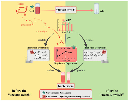 The higher the glucose concentration, the longer the “acetate switch” point (30 h in Glu2, 36 h in Glu5, and 96 h in Glu20), indicating that the “acetate switch” was related to the concentration of added glucose under the glucose concentration gradient set in this experiment. The viable count of HD1.7 initially increased, then decreased, and subsequently displayed secondary growth, suggesting that intracellular acetate could be used as a backup carbon source to induce the secondary growth of bacteria. Energy increased before the “acetate switch” and decreased afterward. The “acetate switch” could act as an energy switch, regulating bacterial growth and QS before the “acetate switch” and affecting the production of Paracin 1.7 due to energy loss after the “acetate switch”. The discussion of the results revealed that acetate and energy jointly influenced Paracin 1.7 production through different divisions of labor (Figure 7). Moreover, the impact of the “acetate switch” on metabolic pathways such as fatty acid synthesis and QS further highlighted its importance in optimizing bacteriocin production. This study laid a theoretical foundation for improving the bacteriocin yield of probiotics in industrial production in the future.