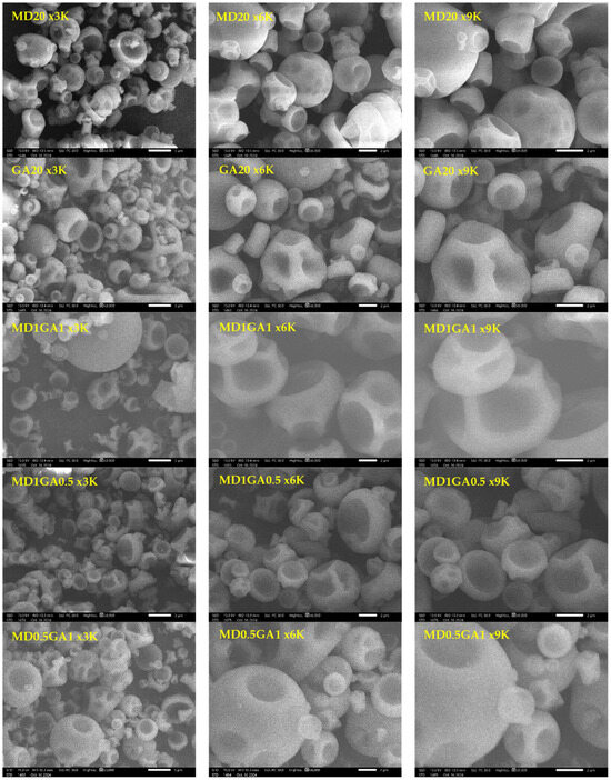 The morphology of spray-dried encapsulated fingerroot powder by the types and ratios of wall materials, specifically maltodextrin and gum arabic, is shown in Figure 1. The spherical shapes observed in many spray-dried powders are primarily attributed to the rapid evaporation of water from droplets during the drying process, which creates consistent, solid particles [42]. As shown for MD20, microcapsules are more spherical than other treatments due to the rapid release of water from the MD bonding by evaporation. This process can vary based on the material’s surface activity and the drying conditions, leading to phenomena such as bowl-shaped capsules, which can be seen in MD1GA0.5 and other microcapsules containing GA in the wall formulations. This may arise from uneven drying rates or variations in wall material viscosity [43,44]. Furthermore, GA film can have high stretching ability during water evaporation from inside the particle, causing microcapsules to expand. Once the water evaporates, the film can shrink in its rubbery state before turning into a dry, glassy state. As a result, microcapsules appear irregular and less spherical. Encapsulation efficiency and stability are further enhanced when an appropriate wall material composition is used, as it influences not only the morphology but also provides a protective shell that minimizes degradation of the core compounds [45].