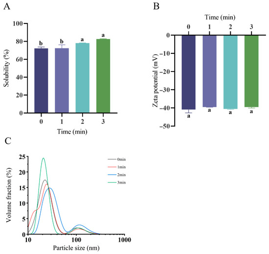 Figure 1A demonstrates the enhanced protein solubility after the plasma treatment (82.63 ± 0.33% at 3 min) versus untreated controls (72.17 ± 1.66%), representing a 14.49% increase. This elevation correlates with cold plasma oxidation generating hydrophilic moieties (e.g., carbonyl/hydroxyl groups). Corresponding ζ-potential values appear in Figure 1B. The zeta potential values for the 0 min, 1 min, 2 min, and 3 min groups were −40.96 ± 1.76 mV, −39.58 ± 0.05 mV, −40.61 ± 0.19 mV, and −40.18 ± 0.96 mV, respectively. There were no significant differences in the zeta potential values between the native and plasma-treated samples (p = 0.418; p > 0.05). Figure 1C and Table 1 characterize the particle size distributions for native and plasma-treated OPI/casein dispersions, revealing consistent bimodality. Plasma processing induced significant particle enlargement versus the controls. Progressive peak right-shifting at 1–2 min treatment durations confirmed the size expansion. Conversely, the 3 min treatment triggered left-shifting (Figure 1C), suggesting partial size reduction, although the mean diameters remained elevated relative to the untreated samples.