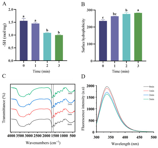 3.2. Free Sulfhydryl, FTIR, and Surface Hydrophobicity Analyses