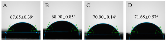 Wettability analysis of the OPI/casein mixtures with different ACP treatments. Contact angle of OPI/casein with treatment time: 0 min (A), 1 min (B), 2 min (C), and 3 min (D). Different letters indicate significant differences (p < 0.05) among the groups.