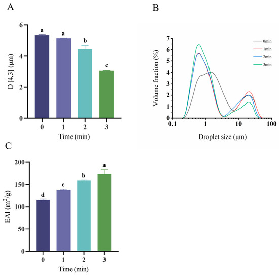 Emulsion droplet size distribution and volumetric mean diameter (D [4,3]) critically govern emulsion functionality, as depicted in Figure 4A,B. All systems displayed characteristic bimodal distribution profiles, although peak positions and amplitudes varied significantly with plasma exposure duration. Specifically, the droplet dimensions exhibited pronounced time-dependent modulation under plasma processing (p = 0.000; p < 0.05). Emulsions stabilized by native OPI/casein complexes exhibited a volumetric mean diameter of 5.364 ± 0.034 μm (Figure 4A). A progressive reduction in droplet dimensions occurred with an extended plasma exposure duration, culminating in a significantly diminished average size of 3.075 ± 0.016 μm following the 3 min treatment. This reduction suggests the formation of a thick and elastic interfacial film around the oil droplets induced by the rise of the surface hydrophobicity. The emulsification activity index (EAI) is presented in Figure 4C. The EAI significantly increased with a prolonged plasma treatment time (p = 0.000; p < 0.05). This phenomenon corresponded with the result above. This is due to the fact that proteins unfold after plasma treatment and more hydrophilic and hydrophobic groups are exposed, resulting in increased protein amphiphilicity.