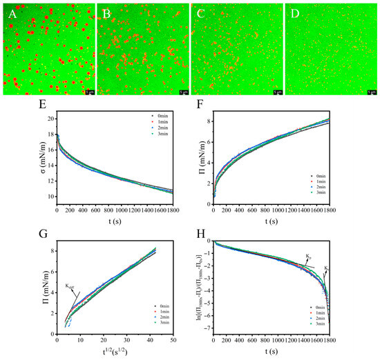 Morphology of emulsions stabilized by OPI/casein with different ACP treatment times. Treatment times of 0 min (A), 1 min (B), 2 min (C), and 3 min (D). (E) Temporal evolution of interfacial tension (σ). (F) Interfacial pressure (π) kinetics over time. (G) Linear relationship between t 1/2 and π for diffusion rate constant kdiff determination of time dependence of ln [(π1800s − πt)/(π1800s − π0s)] for penetration (kp) and rearrangement rate constant (kr) (H).