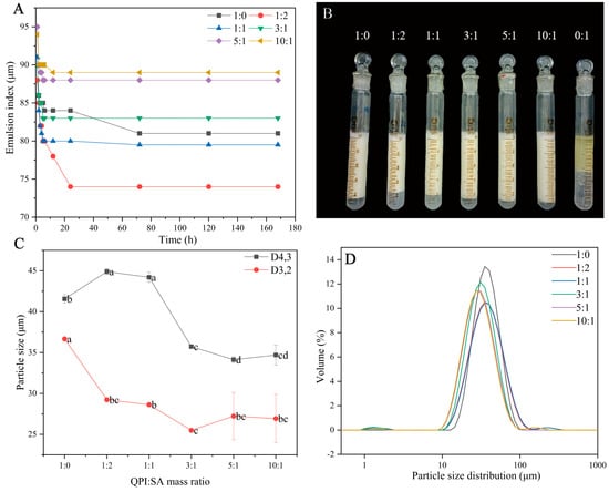 3.2.1. Effect of QPI/SA Mass Ratio on Physicochemical Properties of Pickering Emulsions