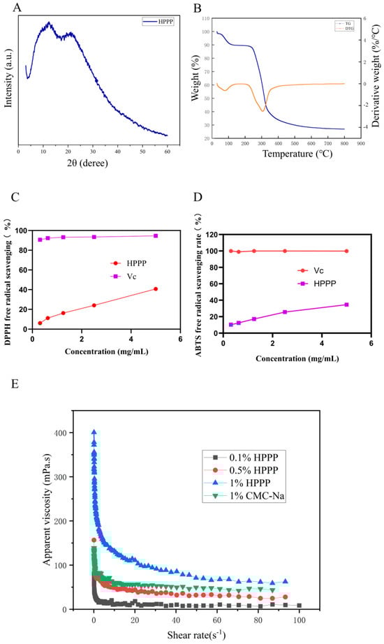 Physicochemical properties of HPPP. (A) X-diffraction pattern of HPPP; (B) Thermogravimetric analysis of HPPP; (C) Viscosity of HPPP solutions as a function of shear rate; (D) DPPH radical scavenging activity; (E) ABTS radical scavenging activity.