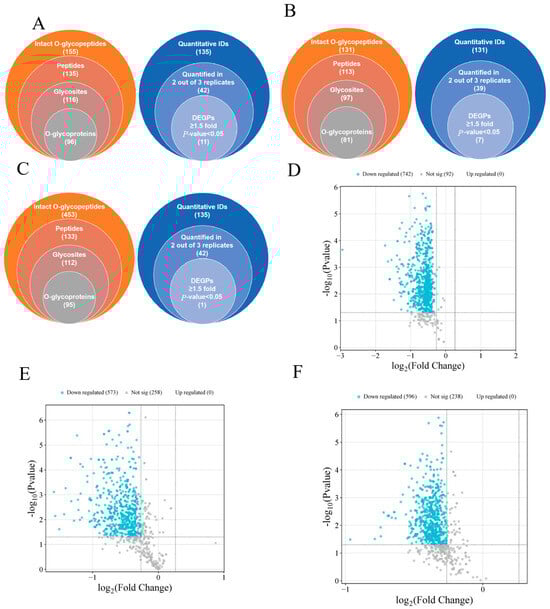 HPPP modulates colonic O-glycosylation. Overall qualitative (left pie) and quantitative results (right pie) of O-glycopeptides from TMT-labeled RPLC-MS/MS analyses of (A) stacked Venn diagrams of the qualitative and HFD vs. NC quantitative results for sample NC; (B) stacked Venn diagrams of the qualitative and HFD vs. HFD-PC quantitative results for sample HFD-PC; and (C) stacked Venn diagrams of the qualitative and HFD vs. HFD-HPPP quantitative results for sample HFD-HPPP quantitative results stacked Venn diagrams. (D) Volcano plot of differentially expressed proteins in the HFD vs. NC sample group; (E) Volcano plot of differentially expressed proteins in the HFD vs. HFD-PC sample group; (F) Volcano plot of differentially expressed proteins in the HFD vs. HFD-HPPP sample group.