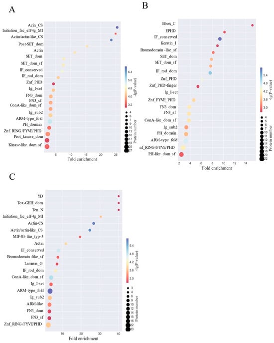 In order to reveal the structural domain enrichment characteristics of glycoproteins and to find significantly enriched structural domains and their corresponding glycoproteins by evaluating the significance level of protein enrichment under a certain structural domain entry, structural domain enrichment analysis was performed [44], which showed that HFD disruption mainly targets cytoskeletal and nuclear regulatory structural domains, and that, in the comparison of the HFD versus the NC group (Figure 3A), actin structural domains (Actin/actin-like_CS, 18-fold enriched, protein 25) and transcription start domain (Initiation_fac_eIF4g_MI, 15-fold enriched, protein 25) were significantly activated, accompanied by high expression of nuclear modification domains (SET_dom_sf, Znf_PHD) (12-fold enriched on average), revealing that HFD impairs the cytoskeleton and gene regulation through disruption of skeletal stability and gene regulation to damage the intestinal barrier; whereas the HFD-PC group partially alleviated the skeletal disorder (Figure 3B) In addition, the HFD-HPPP group drove the remodeling of defensive structural domains (Figure 3C), with strong expression of the toxin-responsive domain Tox-GHH_dom (23-fold enriched, Protein 30) and the basement membrane adhesion domain Laminin_G (22-fold enriched), and the simultaneous and complete removal of the HFD associated actin/nuclear domains (Actin/SET class nulling) and activation of the exogenous detoxification domain YD (16-fold enrichment)-confirming that HPPP achieves active intestinal mucosal protection at the molecular level by establishing a “detoxification-adhesion” double barrier. HPPP is a molecularly active defense of the intestinal mucosa by establishing a double barrier of “detoxification-adhesion”.