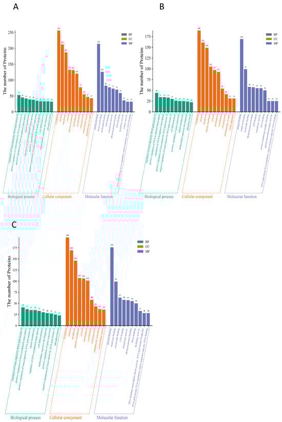 To reveal the functional properties of glycoproteins, the significance level of protein enrichment under functional entries was assessed with the help of GO pathway analysis as an aid to our understanding of the functions of genes and proteins in biological processes and the molecular pathways involved [45]. The results showed that in the HFD versus NC group comparison (Figure 4A), differential glycoproteins were significantly enriched in nuclear transcriptional regulation (e.g., RNA polymerase II-related functional proteins had 53) as well as in nuclear fractions (77% of the total), suggesting that the HFD disrupts intestinal homeostasis by interfering with gene expression; when the HFD versus HFD-PC group comparison was made (Figure 4B), the transcriptional functions remained predominantly transcriptional (e.g., RNA polymerase II regulatory proteins were 44), although the DNA-binding category of molecular functions decreased to 169 (down from 212 in the NC group), suggesting that the HFD-PC group only partially repaired the transcriptional imbalance; a functional remodeling was seen in the comparison of the HFD with the HPPP group (Figure 4C): a dramatic decrease in the number of proteins related to transcriptional regulation (e.g., only 37 in the RNA polymerase II function), and Instead, they were enriched in signaling (101), protein binding (176) and ATP binding (99), reflecting that phytopolysaccharides almost completely blocked the perturbation of glycoprotein function by HFD by strengthening the basic binding and signaling pathways.