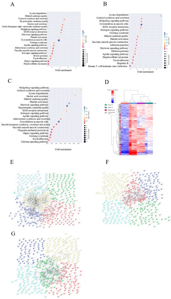Radical repair of metabolic pathways by HPPP intervention. (A) Differential expression of glycoprotein KEGG metabolic pathway analysis in the HFD vs. NC sample group; (B) Differential expression of glycoprotein KEGG metabolic pathway analysis in the HFD vs. HFD-PC sample group; (C) Differential expression of glycoprotein KEGG metabolic pathway analysis in the HFD vs. HFD-HPPP sample group. (D) Heatmap of O-glycosidases found in the colon of mice in each group; (E) Differential expression of glycoprotein PPI interactions network in the HFD vs. NC sample group; (F) Differential expression of glycoprotein PPI interactions network in the HFD vs. HFD-PC sample group; (G) Differential expression of glycoprotein PPI interactions network in the HFD vs. HFD-HPPP sample group.