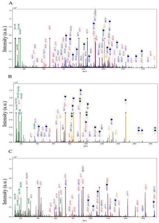 The analysis was carried out on a Dionex Ultimate 3000 RSLC nano HPLC (Thermo Fisher Scientific) using a 70 cm long, 75 μm ID C18 analytical column, where buffer A was a 0.1% formic acid aqueous solution and buffer B was a 0.1% formic acid acetonitrile solution [32,33]. The eluted intact O-glycopeptides were detected by a Q Exactive mass spectrometer with a mass spectral acquisition range of 500–2000 m/z and a mass resolution of 60,000 (at m/z 200), and 30,000 in MS/MS mode. Data-dependent mode (Top20) and high-energy collisional dissociation (HCD) were used to acquire fragmentation information, and MS scans were performed by an automatic gain control (AGC) target value and maximum injection time were 3 × 106 and 20 ms, respectively, and the target value and maximum injection time for MS/MS scans were 5 × 105 and 250 ms, respectively. the separation window and dynamic exclusion time were set to 0.7 m/z and 30.0 s, respectively, and the temperature of the ion-transfer capillary was set to 300 °C, and the spray voltage was set to 1.9 kV.