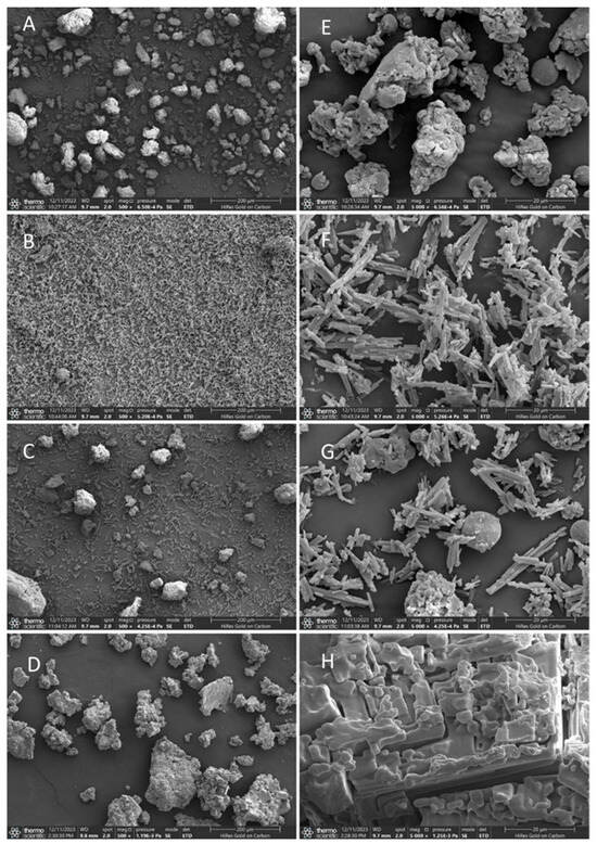 SEM images of β-glucan–quercetin complexes (GQ). Submicroscopic structure of individual β-glucan (A), individual quercetin (B), physical mixture of β-glucan–quercetin (C), and GQ (D) at 500× magnification. Submicroscopic structure of individual β-glucan (E), individual quercetin (F), physical mixture of β-glucan–quercetin (G), and GQ (H) at 5000× magnification.