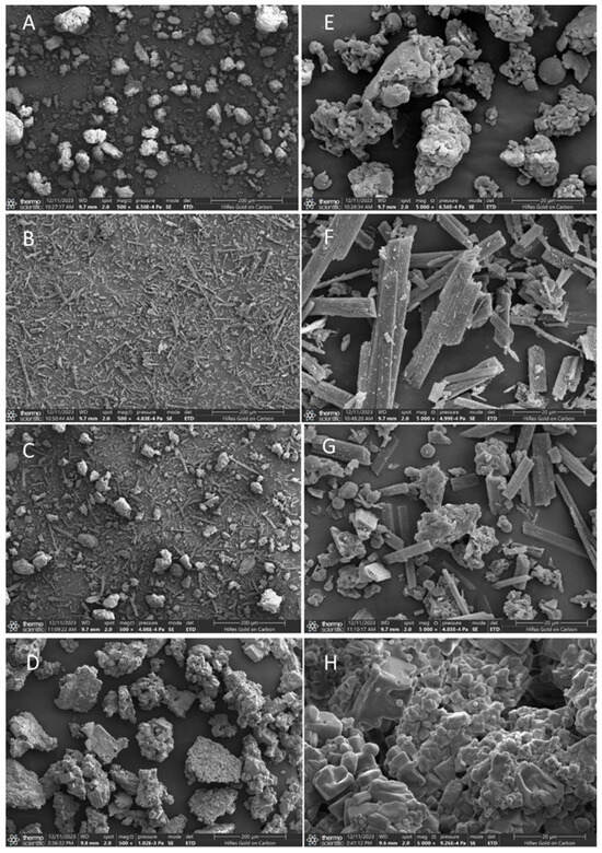 SEM images of β-glucan–ferulic acid complexes (GF). Submicroscopic structure of individual β-glucan (A), individual ferulic acid (B), physical mixture of β-glucan–ferulic acid (C), and GF (D) at 500× magnification. Submicroscopic structure of individual β-glucan (E), individual ferulic acid (F), physical mixture of β-glucan–ferulic acid (G), and GF (H) at 5000× magnification.