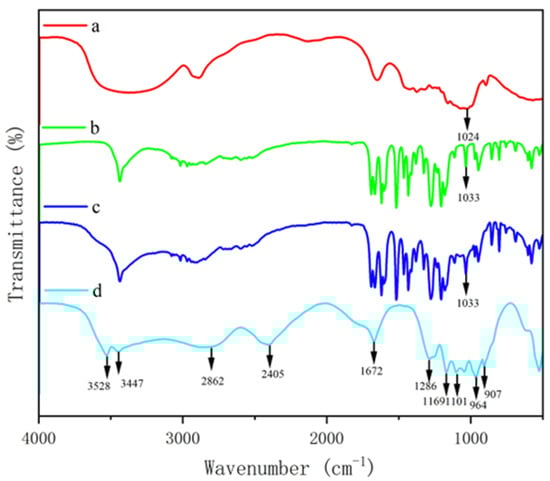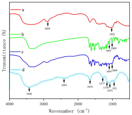 FTIR spectra of β-glucan and quercetin complex. β-glucan (a), quercetin (b), PGQ (c), GQ (d).