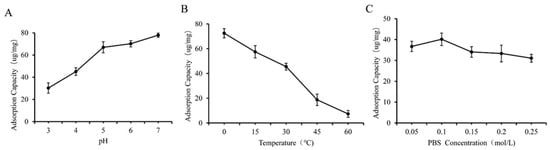 One-way experiment: The effects of three factors, including pH, PBS concentration, and temperature, on the preparation of GF (GQ) were investigated using the adsorption capacity as the indicator.