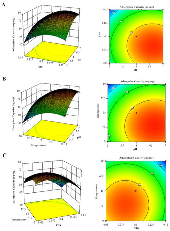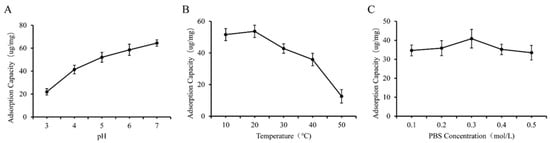 The above complexes’ characteristics demonstrate that the equilibrium dialysis method used in this paper can be successfully used to prepare polysaccharide and phenol complexes. Because equilibrium dialysis is a convenient and easily scaled-up method used in mass production, we need to investigate the factors that affect its efficiency and then optimize the parameters. Therefore, we attempted to test the effect of variations in pH, temperature, and PBS concentration on the yield of GF and GQ. The adsorption capacity (calculated using the formula in Section 2.3) of β-glucan on ferulic acid or quercetin is used as an indicator to measure the yield of GF and GQ.