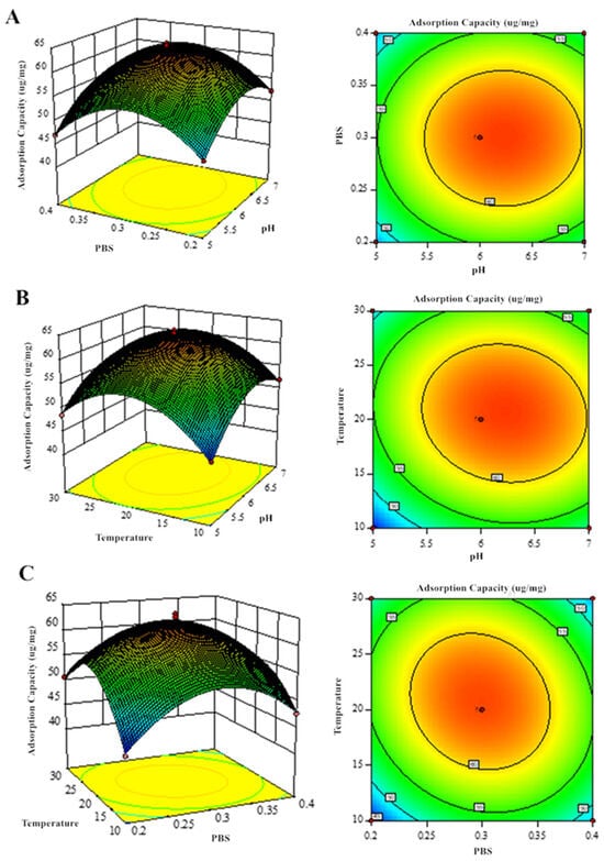 Response surface analysis of GQ production showing binary factor interactions: (A) PBS–pH, (B) temperature–pH, and (C) temperature–PBS concentration effects.
