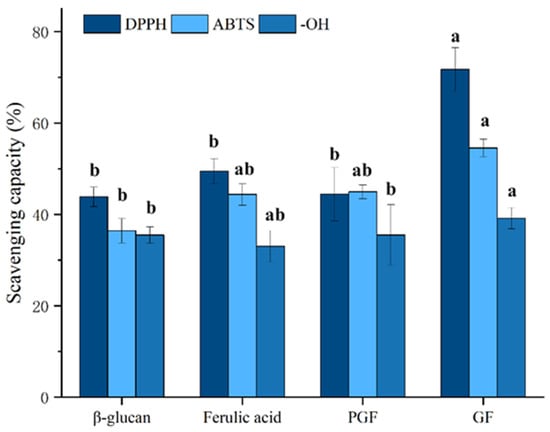 The in vitro antioxidant capacities of GF. Data are expressed as mean ± SEM, and different letters indicate significant differences in the same category (p < 0.05).