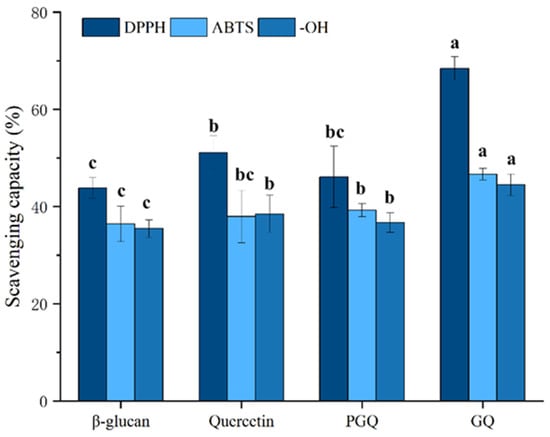 The in vitro antioxidant capacities of GQ. Data are expressed as mean ± SEM, and different letters indicate significant differences in the same category (p < 0.05).