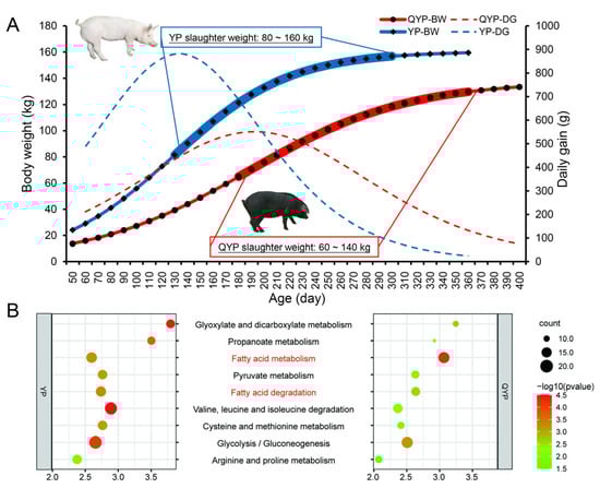Differences in growth and development of Yorkshire pigs and Qingyu pigs. (A) The growth curve of YPs and QYPs. (B) KEGG pathway enrichment analysis of the top 500 expressed genes in the longissimus dorsi muscle of Yorkshire pigs (left) and Qingyu pigs (right).