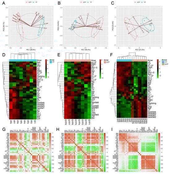 Overall characteristics of carcass and meat quality of lean and fat pigs. (A–C) Principal component analysis (PCA) of carcass traits (A), meat quality traits (B), and nutritional components (C) reveals distinct clustering between lean-type (Yorkshire) and fat-type (Qingyu) pigs. (D,E) Hierarchical clustering heatmaps of carcass, meat quality, and nutritional traits at different body weight stages in lean-type (D) and fat-type pigs (E). (F) Global clustering analysis of all traits across both breeds. (G,H) Correlation heatmaps of carcass and meat quality traits within lean-type (G) and fat-type pigs (H). (I) Global correlation network combining both breeds.