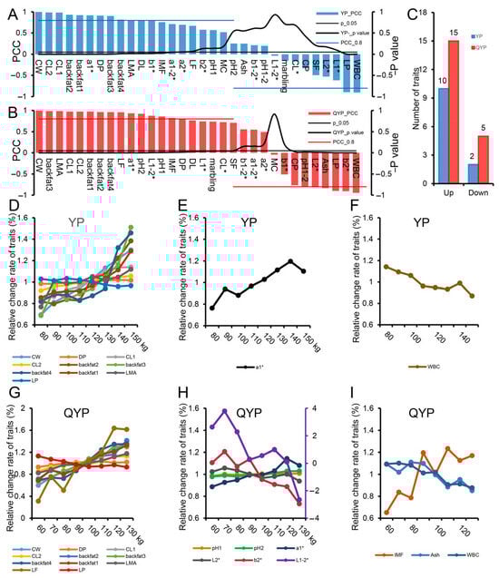 The changes in carcass and meat quality indexes of lean and fat pigs. (A,B) Identification of significantly altered carcass traits, meat quality traits, and nutritional components in lean-type (A) and fat-type pigs (B) based on significance and correlation analyses. (C) Summary of the number of upregulated and downregulated traits in each pig type. (D–F) Dynamic changes in carcass (D), meat quality traits (E), and nutritional composition traits (F) in lean-type pigs with increasing body weight. (G–I) Dynamic changes in carcass (G), meat quality traits (H), and nutritional composition traits (I) in fat-type pigs during growth.
