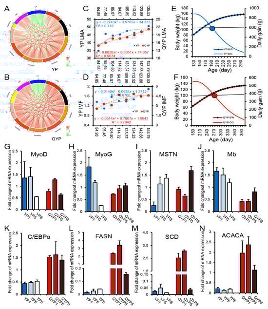 Muscle development and fat deposition capacities are closely associated with carcass and meat quality traits in pigs. We first performed correlation analyses between traits directly related to muscle growth and fat deposition—including carcass traits, meat quality parameters, and nutritional components—in lean-type (Figure 4A) and fat-type pigs (Figure 4B). Notably, the correlation patterns differed markedly between the two types. Fat-type pigs exhibited stronger overall correlations among these traits, suggesting a more coordinated regulation of muscle and fat development compared to lean-type pigs. Subsequently, we analyzed the relationship between the LMA (longissimus muscle area) and body weight in both pig types using curve fitting (Figure 4C). In lean-type pigs, the LMA increased rapidly after the inflection point but gradually plateaued around 130 kg. In contrast, fat-type pigs showed a stable and continuous increase in the LMA beyond the inflection point. Conversely, IMF (intramuscular fat) exhibited an opposite pattern between the two pig types (Figure 4D). In lean-type pigs, the rate of IMF accumulation accelerated after the inflection point, while in fat-type pigs, IMF deposition slowed and reached a plateau around 110 kg. Although LMA growth decelerated in lean-type pigs post inflection, their absolute LMA values remained much higher than those of fat-type pigs, which would require significantly more time to reach comparable muscle area. Similarly, fat-type pigs showed much higher IMF levels than lean-type pigs. In addition, we calculated the time point at which the growth rate declined most significantly after the inflection point. The results showed that in lean-type pigs, the growth rate dropped rapidly after approximately 200 days of age, whereas in fat-type pigs, this occurred around 270 days of age (Figure 4E,F). We also quantified the expression levels of marker genes associated with muscle development and fat deposition in muscle and fat tissues. The expression profiles were consistent with observed phenotypic trends. Lean-type pigs displayed higher expression of genes related to muscle growth compared to fat-type pigs. Additionally, in lean-type pigs, the expression of the pro-myogenic genes MyoD and MyoG declined with increasing body weight, while the expression of the inhibitory gene MSTN increased; Mb (myoglobin) expression also gradually decreased. In fat-type pigs, these trends were reversed (Figure 4G–I). For adipogenic genes, fat-type pigs exhibited generally higher expression levels than lean-type pigs. However, with increasing body weight, these genes showed decreasing expression trends in fat-type pigs but increasing trends in lean-type pigs (Figure 4K–N).