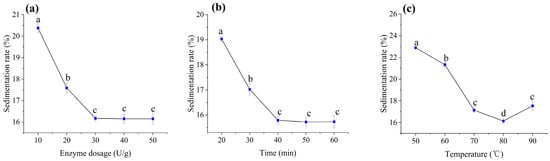 Effects of liquefaction parameters on centrifugal sedimentation rate: (a) enzyme dosage, (b) time, and (c) temperature. Mean values with different letters (a, b, c, d) differ significantly (p < 0.05) by Duncan’s multiple range test. The letter ’a’ represents the group with the highest mean, followed by b, c, and d in decreasing order.