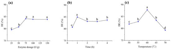 Effects of saccharification parameters on DE value: (a) enzyme dosage, (b) time, and (c) temperature. Mean values with different letters (a, b, c, d) differ significantly (p < 0.05) by Duncan’s multiple range test. The letter ’a’ represents the group with the highest mean, followed by b, c, and d in decreasing order.