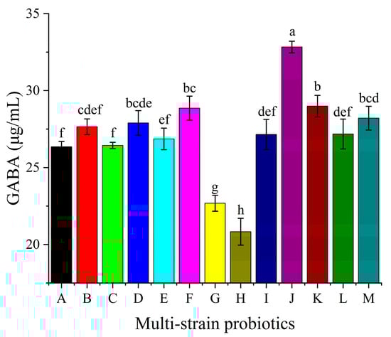GABA production by different multi-strain probiotics (A–M). Mean values with different letters differ significantly (p < 0.05) by Duncan’s multiple range test. The letter ’a’ represents the group with the highest mean, followed by b, c, d, e, f,g and h in decreasing order.