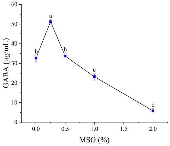Effect of MSG on GABA content. Mean values with different letters (a, b, c, d) differ significantly (p < 0.05) by Duncan’s multiple range test. The letter ’a’ represents the group with the highest mean, followed by b, c, and d in decreasing order.