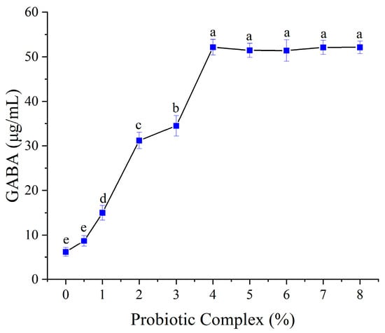 Effect of probiotic inoculum size on GABA content. Mean values with different letters differ significantly (p < 0.05) by Duncan’s multiple range test. The letter ’a’ represents the group with the highest mean, followed by b, c, d and e in decreasing order.