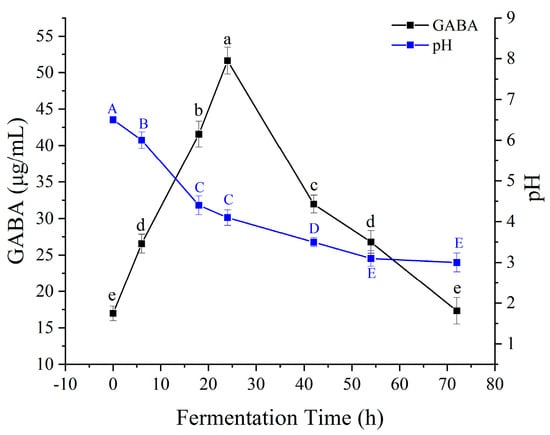 Temporal profiles of GABA content and pH during fermentation. Uppercase letters (A–E) and lowercase letters (a–e) indicate significant differences (p < 0.05) among means within their respective data groups by Duncan’s multiple range test. For each letter system, the letter ’A’ (or ’a’) denotes the highest mean value, followed by subsequent letters (B, C, D, E / b, c, d, e) in decreasing order. Letters are not comparable between the two systems.