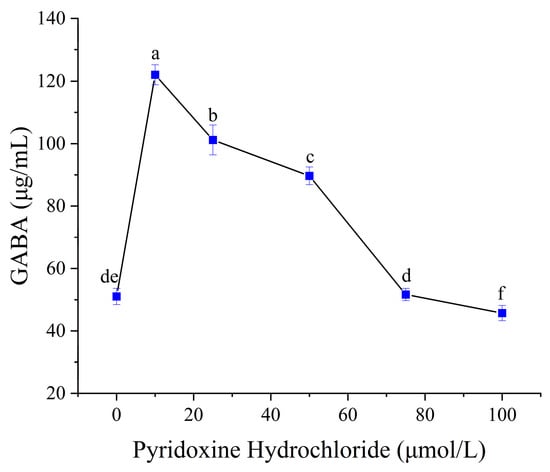 Effect of pyridoxine hydrochloride concentration on GABA synthesis. Mean values with different letters differ significantly (p < 0.05) by Duncan’s multiple range test. The letter ’a’ represents the group with the highest mean, followed by b, c, d, e and f in decreasing order.