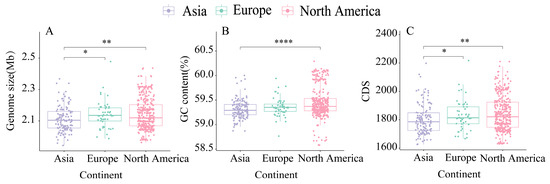 Genome comparison of 543 B. adolescentis strains across different continents. (A) Genome size; (B) GC content; (C) CDS. There is a statistically significant difference between the three groups represented by * (Wilcoxon test, significance level: * represents p < 0.05, ** represents p < 0.01, **** represents p < 0.0001).
