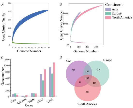 The pan-genome of 543 B. adolescentis strains comprised 16,696 genes, including 412 core genes (2.47%), 4662 unique genes (27.92%), and 11,622 ancillary genes (69.61%). The core-genome curve demonstrated an initial rapid decline, followed by gradual stabilization as the number of genomes analyzed increased, whereas the pan-genome curve remained open, indicating ongoing genomic expansion (Figure 3A). Notably, the pan-gene curves varied among strains originating from different geographical locations, with Asian isolates exhibiting a significantly higher pan-genome expansion than North American isolates (Figure 3B).
