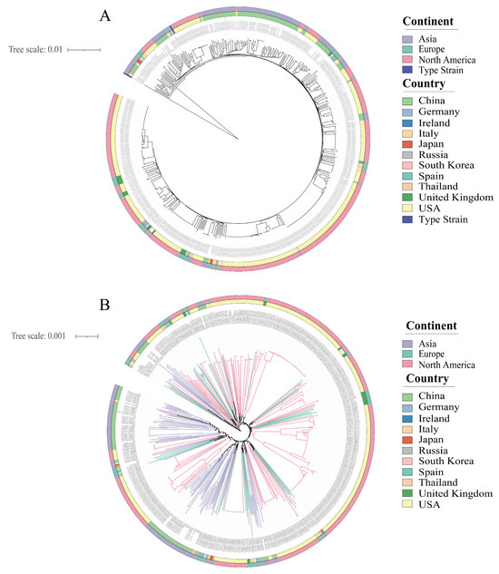 The phylogenetic relationships among B. adolescentis strains were assessed using Bifidobacterium ruminantium LMG 21811T [25], which is closely related to B. adolescentis, as an outgroup (Figure 4A). Branch lengths reflected genetic distances, clearly distinguishing the 543 B. adolescentis strains from the outgroup and confirming their classification as a single species. Additionally, a radial phylogenetic tree constructed based on 413 core genes from 542 B. adolescentis strains (excluding the outgroup) showed distinct clustering patterns (Figure 4B). Asian and North American isolates predominantly formed distinct clusters, whereas European isolates appeared more dispersed, but displayed partial clustering tendencies. At the national scale, the strains generally clustered according to their country of origin. Within Europe, isolates from Italy, Spain, and the United Kingdom formed a coherent cluster, consistent with the clustering observed, based on the ANI values.