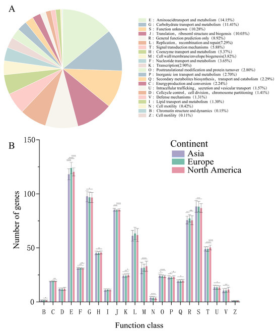 Analysis of isolates from different geographical regions indicated significant variations in the abundance of families E, G, J, L, T, H, R, and S. Families S and R, which lack clearly defined functions, were excluded from subsequent comparative analyses because of ambiguity regarding their specific roles (Figure 6B).