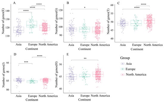 Consequently, differences among families E, G, J, L, T, and H were further analyzed (Figure 7). For family E, European isolates showed a significantly higher abundance than Asian and North American isolates (p < 0.0001). In family G, the number of Asian isolates significantly exceeded that of North American isolates (p < 0.05). Family T genes were significantly more abundant in North American isolates than in Asian and European isolates (p < 0.0001). For family J, isolates from Asia differed significantly from European isolates (p < 0.001), and North American isolates differed more significantly from European isolates (p < 0.0001). Finally, family H genes were significantly more abundant in North American than in Asian isolates (p < 0.01).