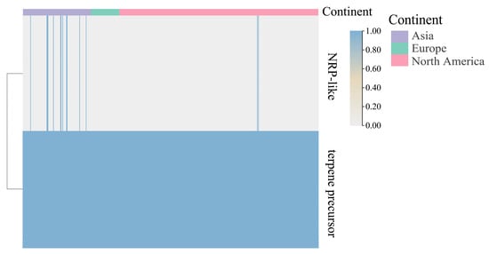 Additionally, gene clusters associated with NRP-like metabolism, which is integral to the biosynthesis and modification of small-molecule metabolites [27], were also annotated. NRP-like pathways are important for synthesizing medically and industrially relevant compounds, including antibiotics, antifungal agents and immunosuppressants. Remarkably, these NRP-like clusters exhibited distinct geographical clustering: among the 14 identified clusters, 12 were exclusive to Asian isolates, 2 were present in North American isolates, and European isolates lacked NRP-like gene clusters entirely (Figure 9).