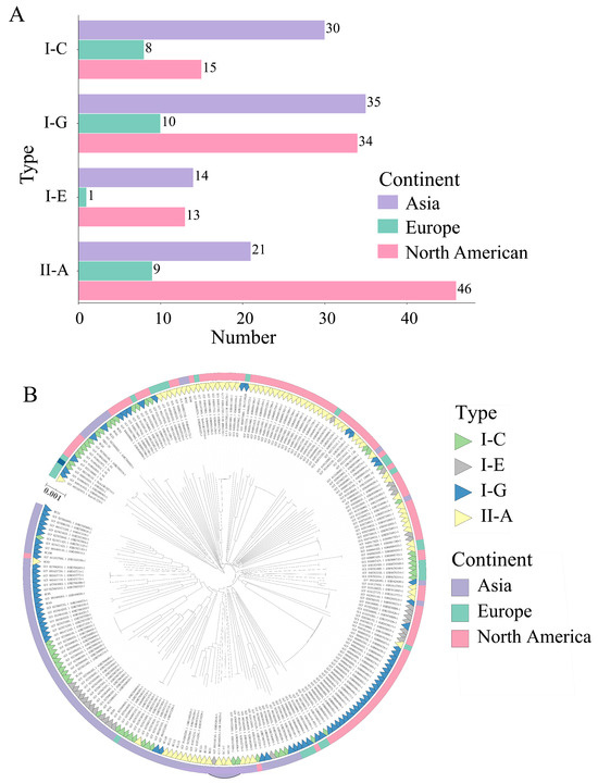 The immune defense characteristics of B. adolescentis were analyzed by CRISPR-Cas. The research found that, among 543 strains of B. adolescentis, the genomes of 237 strains encoded the CRISPR-Cas system based on the presence of Cas marker proteins, including 100 Asian isolates, 108 North American isolates and 28 European isolates. There are four subtypes of CRISPR-Cas, namely I-G (78 strains), I-C (59 strains), I-E (27 strains), and II-A (73 strains) (Table S5). Type I systems (30.20%) have more categories than Type II systems (13.44%). Isolates from Asia, Europe and North America all have the above subtypes. The I-G content was the highest in the isolates from Asia and Europe, and the II-A content was the highest in North America (Figure 10A). Phylogenetic trees were constructed for strains identified by the CRISPR-Cas system (Figure 10B). It was found that under the same branch, most strains were encoded as homologous systems. This indicates that the repetitive sequences of the same type of CRISPR-Cas system have a high degree of homology on the phylogenetic tree.