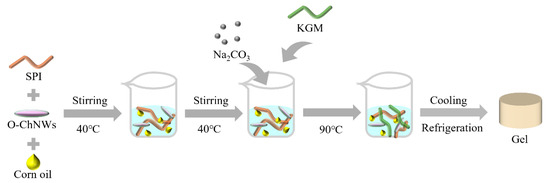To prepare the samples, 0.225% O-ChNWs were dispersed using 50% ultrasonic power for 10 min. The 14.5% SPI powder was then dissolved in deionised water. Varying concentrations of corn oil (0%, 4%, 8%, 12%, 16%) were incorporated into the mixture, which was mechanically stirred at 500 rpm in a 40 °C water bath for 90 min to ensure proper dispersion and hydration. Subsequently, 0.45% Na2CO3 solution was added while increasing the stirring speed to 650 rpm for another min. Then, 1.5% KGM was gradually added and this was constantly stirring for one minute to form a sol. This sol was then heated in a 90 °C water bath for 90 min. After heating, the gel was cooled to room temperature over one hour and refrigerated at 4 °C for 12 h to set. Prior to further analysis, the gels were equilibrated at room temperature for one hour. The samples were labeled SKOC, SKOC4, SKOC8, SKOC12, and SKOC16 for clarity in subsequent evaluations. Figure 1 shows a schematic diagram of the formation of an emulsion gel.