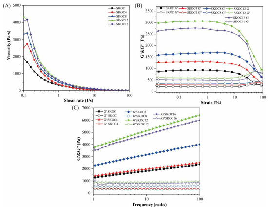 Apparent viscosity is an important index for characterizing the stability of gels; it is used to describe the flow properties of fluids and reflects the difficulty of disrupting the internal structure of the gel. Figure 2A illustrates that as the shear rate increases, the viscosity consistently decreases across all samples, exhibiting a “shear-thinning” phenomenon. High shear rates can lead to the deformation of agglomerated droplets and the breakdown of the network structure, thereby lowering viscosity by reducing flow resistance. Compared to the SKOC system, the addition of corn oil to the composite hydrogel results in higher viscosity. This stability enhancement is attributable to corn oil, which organizes and stabilizes the composite’s structure, making it more resistant to shear-induced alignment and thus increasing its viscosity [18,19]. According to Figure 2A, the network structure formed by SKOC12 is the most difficult to disrupt, indicating the presence of the strongest interactions in this system. When the corn oil content in the composite hydrogel surpasses 12%, no additional increase in apparent viscosity is noted, suggesting that the system’s viscosity stabilizes once the oil concentration reaches this threshold.