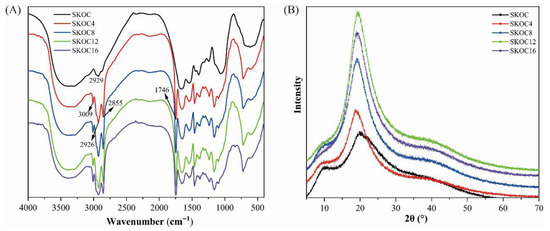 XRD is an effective tool for analyzing the crystalline structures or morphologies of materials, with a direct positive correlation between crystallinity and the sharpness of diffraction peaks (Figure 3B). Higher crystallinity yields more defined peaks [30,31]. All emulsion gels samples displayed a broad peak around 2θ = 20°, indicating that all gels were in an amorphous state [32,33]. The diffraction patterns of SKOC and oil-containing gels were almost the same. Minor differences lie in the sharpness and intensity of the main diffraction peaks. Notably, as the concentration of corn oil increases, the diffraction peaks of the emulsion gels become sharper and more intense. This suggests that the addition of corn oil can partially enhance the crystallinity of the gels. This may be due to the lubrication effect intrinsic to plant oils, which reduces inter-material friction, allowing molecules to move and rearrange more easily. The infiltration of oil promotes more molecular interactions (hydrogen bonding) between SPI, KGM, and O-ChNWs in the gel matrix, thereby increasing the crystallinity of the gel. The increase in crystallinity could lead to the enhanced strength and stability of the emulsion gels.