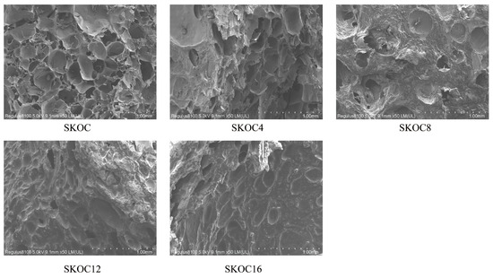 SEM is used to study the network structure of gels. From Figure 4, it is observed that the emulsion gels with heat-induced denatured SPI exhibit a certain mesh structure. Additionally, under alkaline conditions and heating, the random coils of KGM aggregate to form junction zones, creating a three-dimensional network. O-ChNWs act as nanofillers anchored on the SK matrix [34]. The interaction between SPI and KGM molecules enhances the structural integrity of the hydrogel. SKOC displays a regular honeycomb-like structure. The addition of 4% corn oil does not significantly change the network structure of the emulsion gel. However, with further increases in the amount of corn oil, the emulsion gel no longer exhibits a simple porous structure, as the gaps between gels are filled. Protein films are present on the surface of the fat globules, which are combined with protein filaments and the protein matrix. This indicates that the oil particles are not merely filling the three-dimensional protein network structures; instead, there are significant interactions between them. Reference. [35] proposed two main types of forces: (1) Interactions between proteins that orient them parallel along the surface of the oil, bonded by strong bonds such as disulfide bonds; (2) The interaction of the oil with oriented proteins, which involves relocating the hydrophobic groups in the protein backbone to the droplet surface, thereby achieving the adsorption of proteins at the oil–water interface. From this, it is inferred that the effects produced by oils in the gel are constructed through the synergistic actions among the oil, interfacial protein films, and proteins. In the SKOC16 gel, apparent oil droplets are exposed outside, which is due to the limited encapsulating capacity of the gel matrix, unable to accommodate an excess of corn oil.