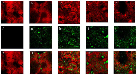 CLSM of emulsion gels. (a–e sequential fluorescence images (red) of the gel complex portion of SKOC, SKOC4-16; f–j sequential fluorescence images (green) of the oil phase portion of SKOC, SKOC4-16; A–E sequential SKOC, SKOC4-16 mixtures;).