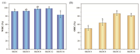WHC quantifies a gel’s ability to retain water, primarily influenced by protein–water interactions, the gel’s structural integrity, and the distribution of water throughout the gel structure [15]. WHC is a key factor affecting the quality of soy products and is closely linked to their textural characteristics. Products with a good water-holding capacity retain moisture internally, effectively reducing water loss and ensuring the overall quality of the product. The impact of oil addition on the water-holding capacity of SKOC gels is shown in Figure 6A. From Figure 6A, the SKOC emulsion gels already possess good water retention abilities, with a water-holding capacity of over 90%. As the corn oil content increases from 4% to 12%, the water-holding capacity of the gel improves. This is due to the addition of corn oil, which fills the voids in the gel matrix, making the gel network more continuous and stable. A stable three-dimensional network can enhance the WHC [38,39]. Studies have shown that the addition of a particular oil phase can improve the density of gel structures by capturing water within their pores through capillary action. Cui et al., [40] found that emulsion gels have higher WHC compared to oil-free gels. This suggests that the presence of oil droplets leads to a stronger capillary force within the gel network to retain water. However, when the oil content reaches 16%, the water-holding capacity decreases. This is due to the excessive presence of oil droplets, which increase pore sizes and reduce capillary forces, thereby disrupting the gel network’s structure and making it effectively retain water.