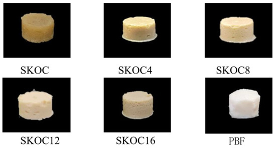 The appearance and color measurements of gels with varying amounts of corn oil are detailed in Figure 7 and Table 1. Visually, the addition of corn oil notably influences the appearance of the gel. Specifically, SKOC gels exhibit a deeper yellow–brown color, which significantly diverges from the appearance of commercial pork back fat, resulting in less appealing sensory properties. However, the incorporation of corn oil does enhance the gel’s coloration. Using a colorimeter for more precise analysis, it was observed that as the corn oil content increased, both the L* values and whiteness of the gels also increased. This is likely due to the increased presence of oil phase and emulsion droplets on the gel’s surface, which enhance light scattering and thus elevate L* values [43]. Conversely, the b* value of the gel remains significantly higher than that of pork back fat, primarily due to the high concentration of yellow-colored SPI inherent in the gel. Similar discrepancies in b* values between experimental gels and pork back fat have been noted in other studies [40]. Interestingly, the L*, a*, and whiteness values of SKOC12 closely approximate those of commercial pork back fat. Given that color significantly impacts consumer food choices, particularly in meat products, SKOC12 holds considerable potential as a substitute for solid fats.